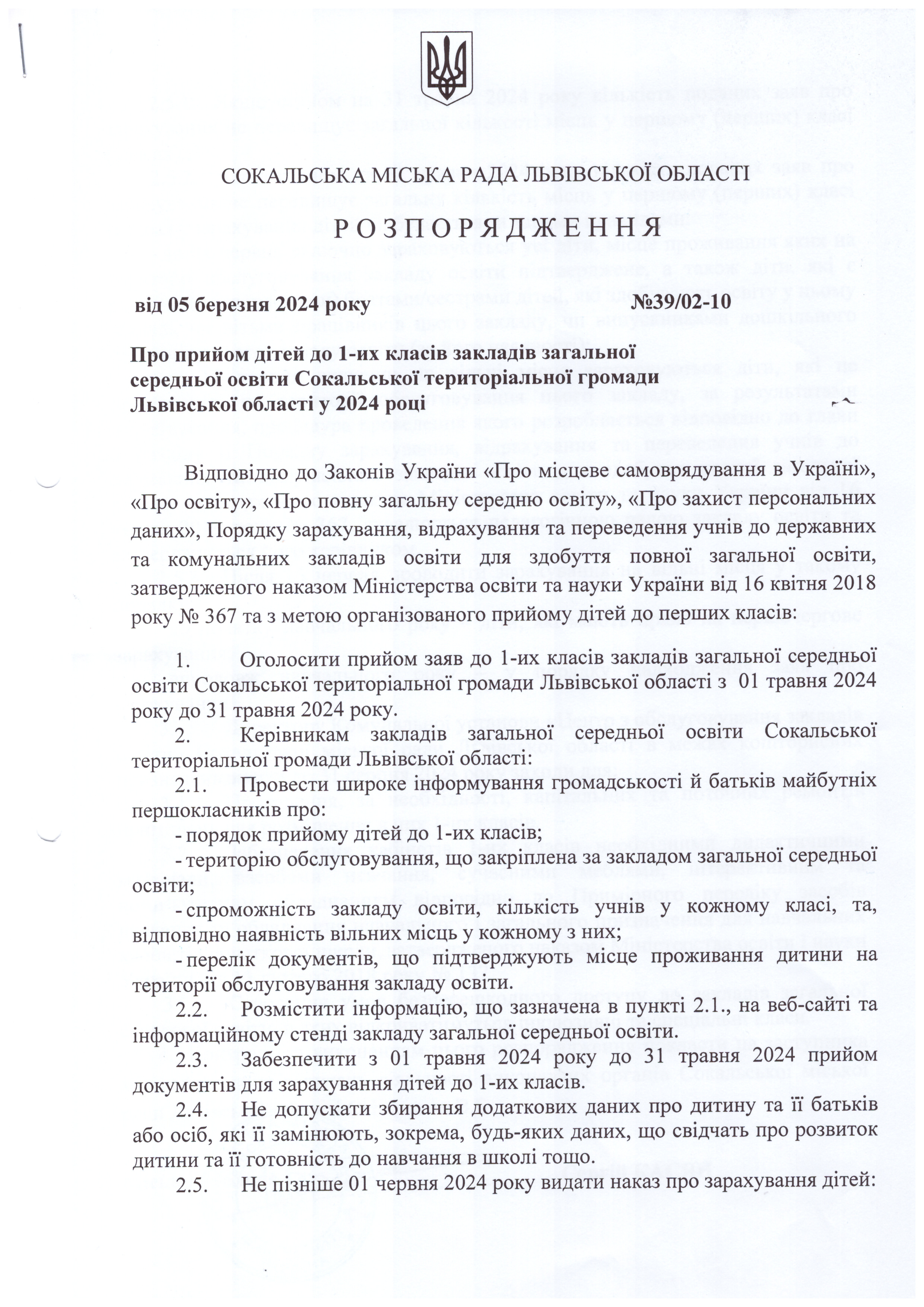 Розпорядження про прийом дітей до 1-их класів