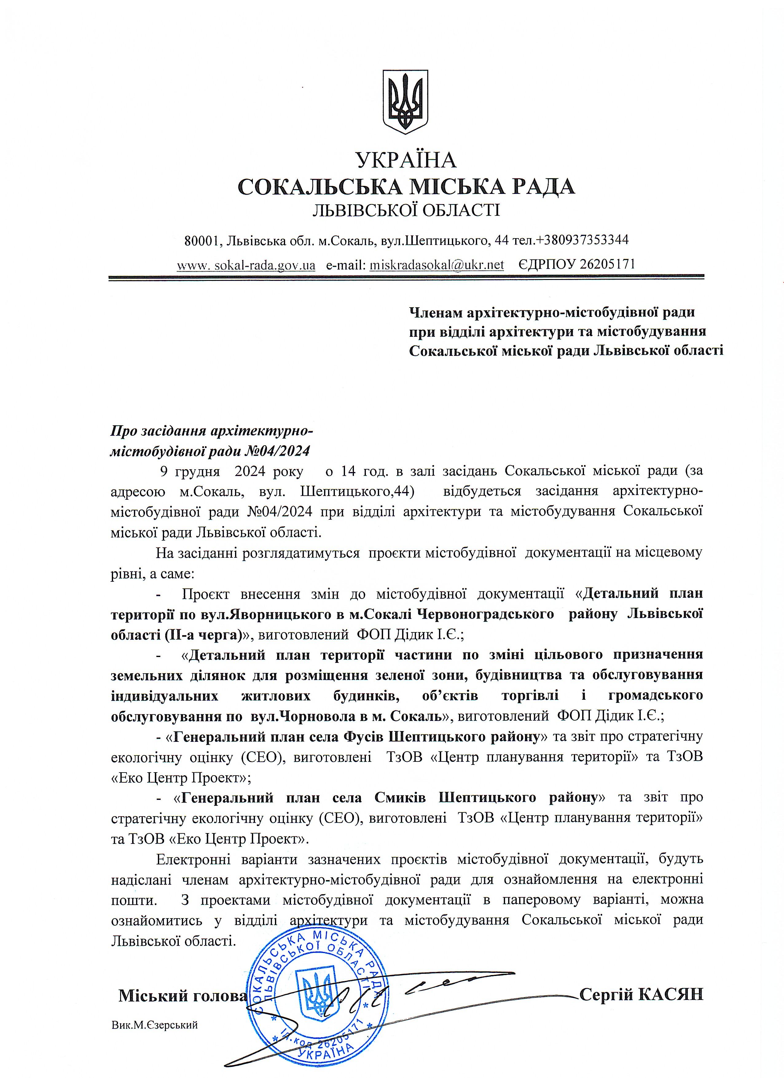 9 грудня 2024 року о 14 год. в залі засідань Сокальської міської ради (за адресою м.Сокаль, вул. Шептицького,44) відбудеться засідання архітектурно-містобудівної ради №04/2024 при відділі архітектури та містобудування Сокальської міської ради Львівської області.