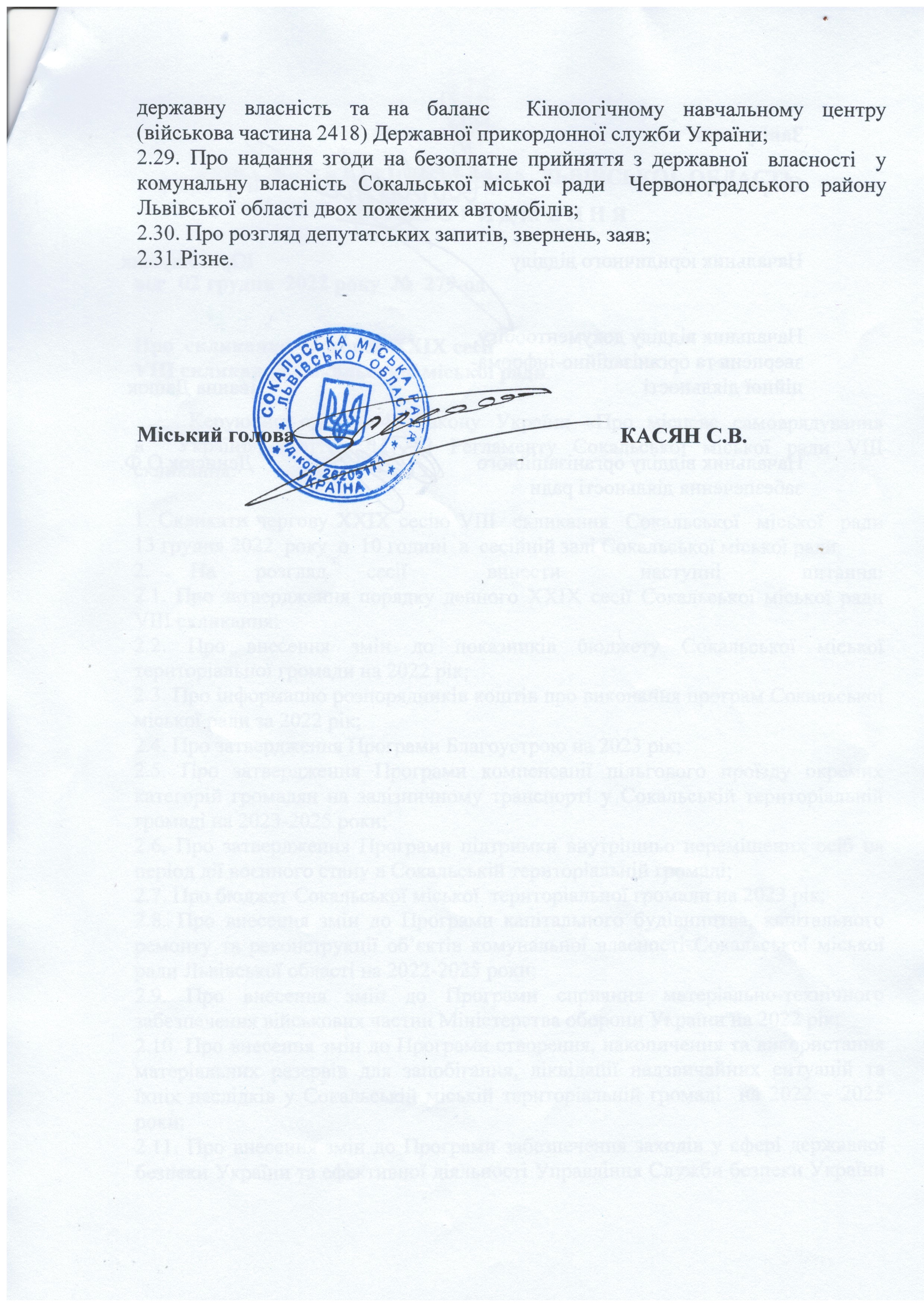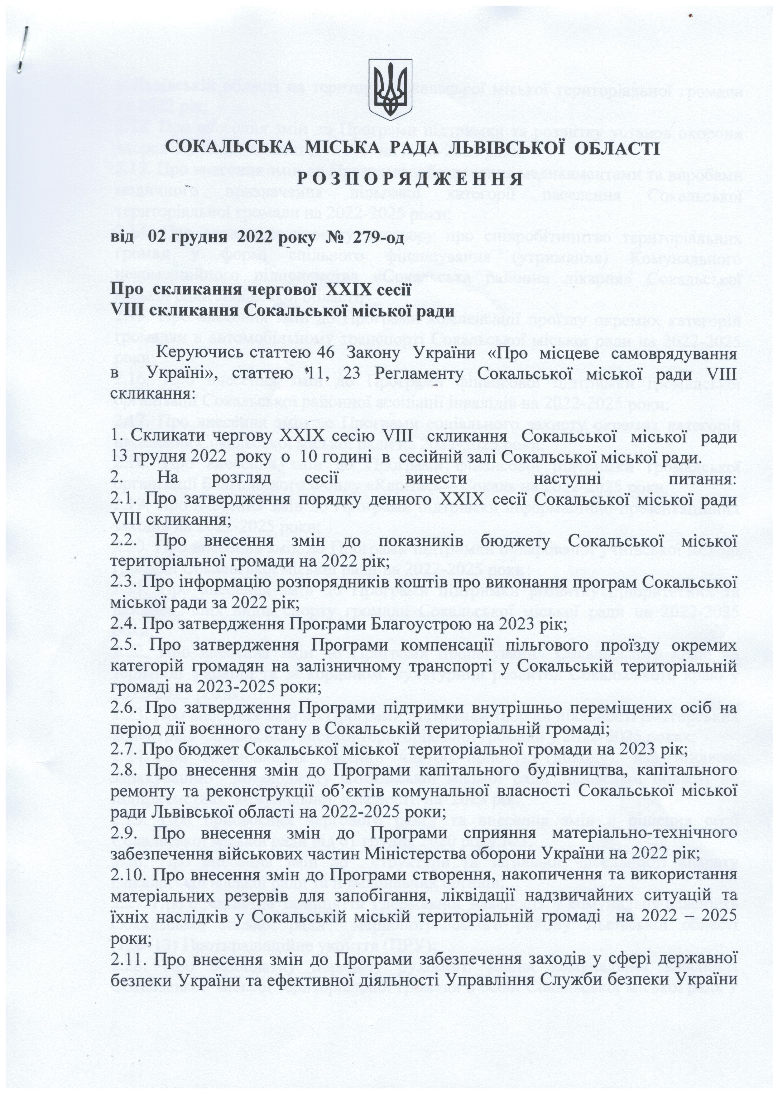 Розпорядження про скликання сесії
