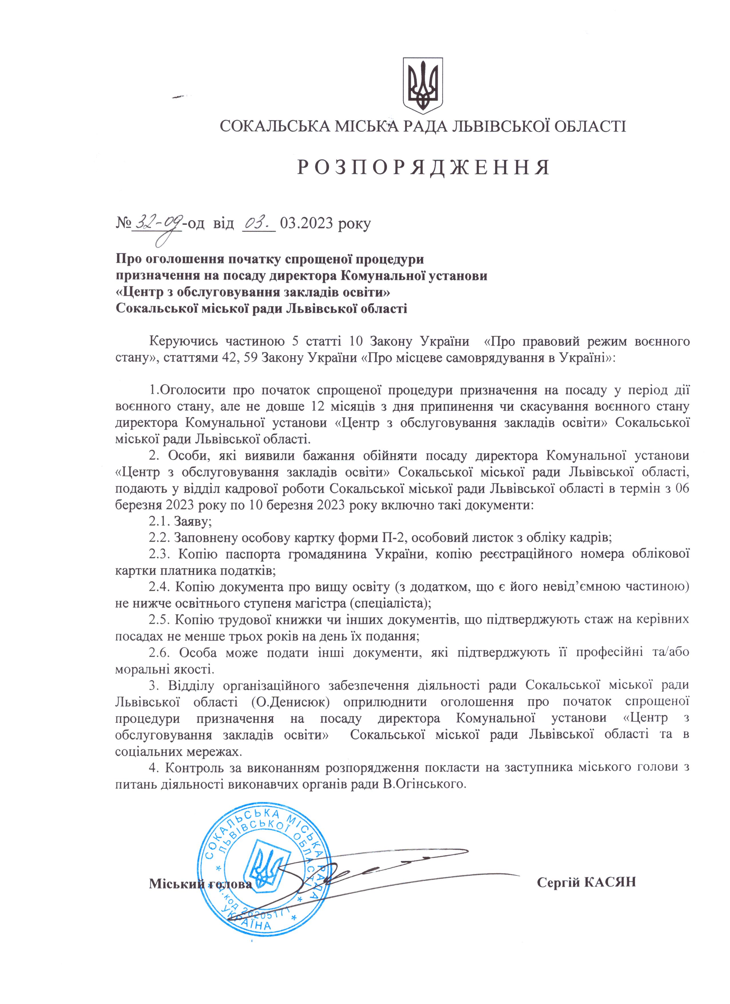 Розпорядження про початок спрощеної процедури призначення на посаду директора КУ "ЦОЗО"
